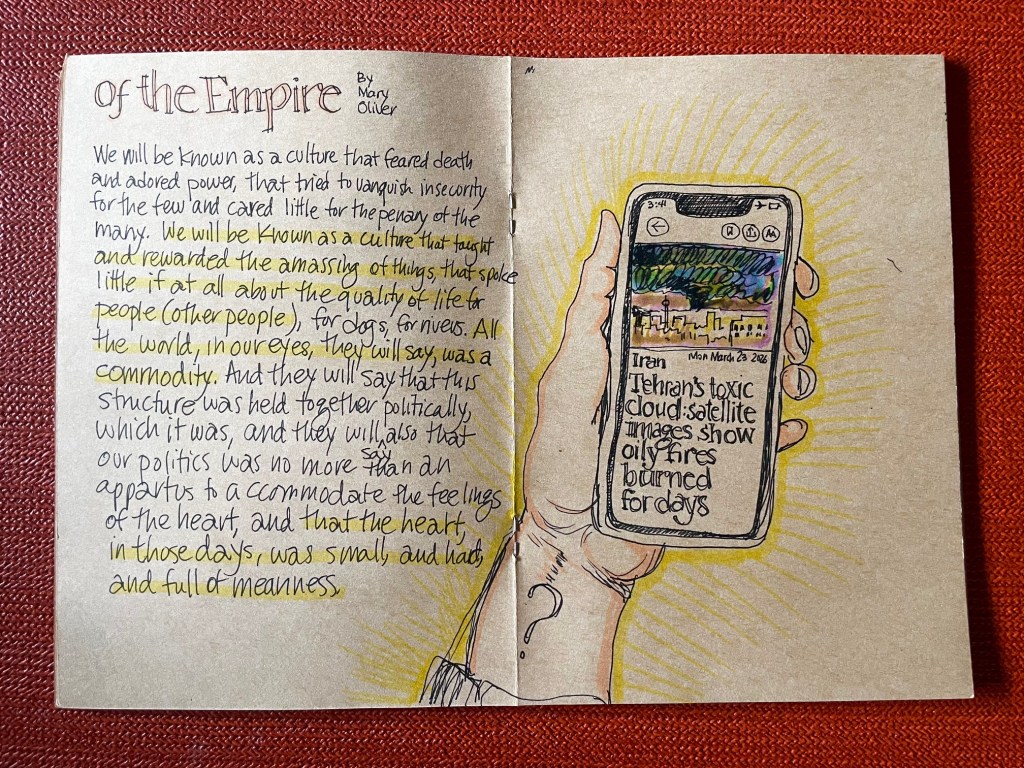 This poem, published in 2008, is evidence that the chaos and cruelty abundant today has been with us all along. Mary Oliver, more well-known for her awe-filled devotion to noticing the natural world, was clearly not unaware of the perils of our consumerist, dominating culture. Which is also part of our world. The part that is imperiling all of us. This current war, far away as it may seem to some, will not spare any of us, eventually. Those who think this can be “won” are fear-driven fools.